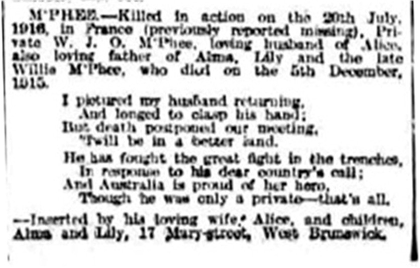 The 206th Casualty List, published in newspapers on 7 September 1916, included W.J.O. McPhee among those reported as missing. Alice would likely have received official notification shortly before this, but the advice provided no details — only that her husband was missing.