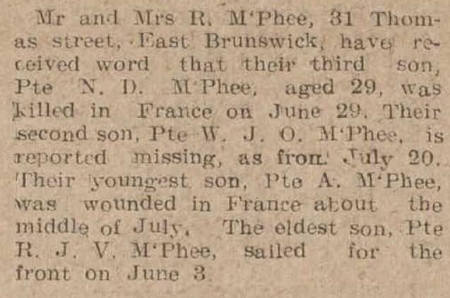 Within little more than a year, the McPhee family had one son killed before Fromelles, one lost at Fromelles, and two others wounded in service.