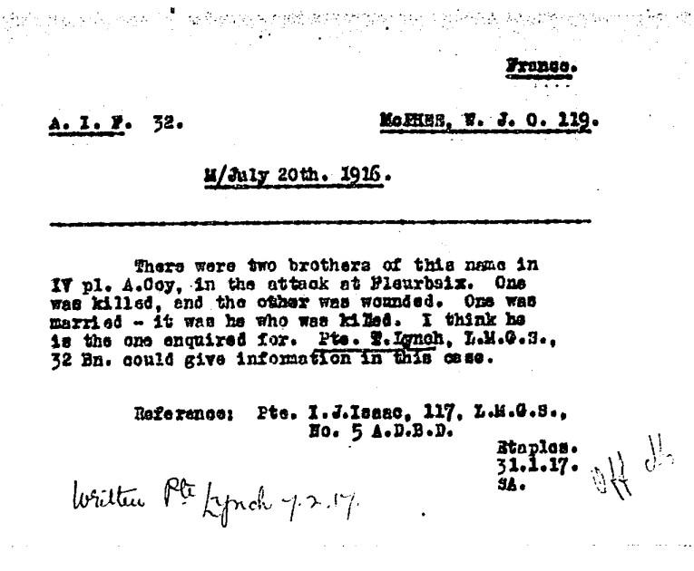 “There were two brothers of this name in 1/ pl. A. Coy, in the attack at Fleurbaix. One was killed, and the other was wounded. One was married – is it he who was killed. I think he is the one enquired for. Private. S. Lynch… 32 Bn. could give information in this case.”