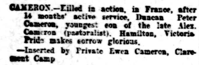 ‘Peter’ Cameron’s file was eventually combined with the file of the discharged ‘Duncan Peter Cameron’ and he appears on the First World War Nominal Roll and the Australian War Memorial Roll of Honour under Duncan Peter Cameron. His first enlistment on 26 September remained his official enlistment date. But it appears the military’s realisation that they were the same man did not come until several years after the war. In all his communication with the military, Ewen Cameron had referred to his brother by his enlisted name of Peter and even the indirect communication of his sister, the Mother Superior, used this name.