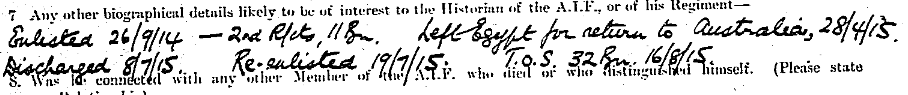 So, on 28 April, the day after Peter was discharged from hospital, he sailed from Suez, arriving in Melbourne on 22 May. It is difficult to be sure of the sequence of events after his return to Australia. It appears that he was sent to Broadmeadows Camp in Melbourne where he was medically examined and determined to be unfit for service. In the meantime, he had been assigned to 7th Reinforcements 6th Battalion and sent for training at Seymour. It took until 2 July for him to be discharged. Almost certainly upset, he immediately filled in a new attestation paper, but the discharge was confirmed.