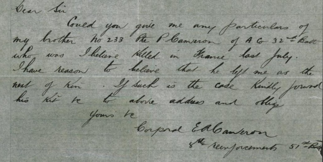 In October 1916, Ewen wrote to Base Records asking for any particulars about the death of his brother and that Peter’s kit be forwarded to him.