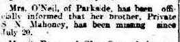 Sam Mahoney was killed during the battle. No record or eye-witness accounts exist to give any indication about what might have happened to him during the battle. However, his body was not recovered, and the military did not have sufficient evidence to officially declare him killed in action immediately after the battle. leaving open the possibility that he may have been wounded, captured, or in hospital. Late in August, Mary O’Neil was informed that he was missing. She passed on the information with a notice in newspapers on 1 September.