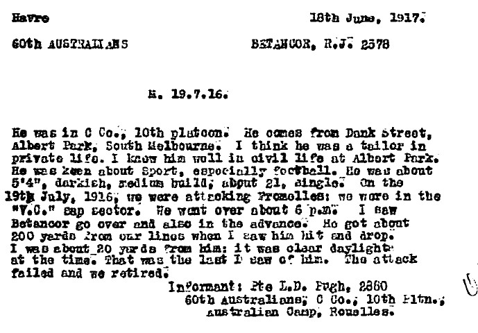 “From Lieut. Francis M. Diamond 772 C. Coy, 60th Battn. I obtained information about this man who was a friend of mine. This officer showed me the disc that had belonged to this man. He informed me that Betancor had been reported missing after the attack at Fromelles on July 19th 1916, and that he (Diamond) had gone out afterwards and found the body of the missing man in No Man's Land between the two front lines (German and British). He did not bring the man in, but buried him in a shell hole and took his disc for identification purposes.”