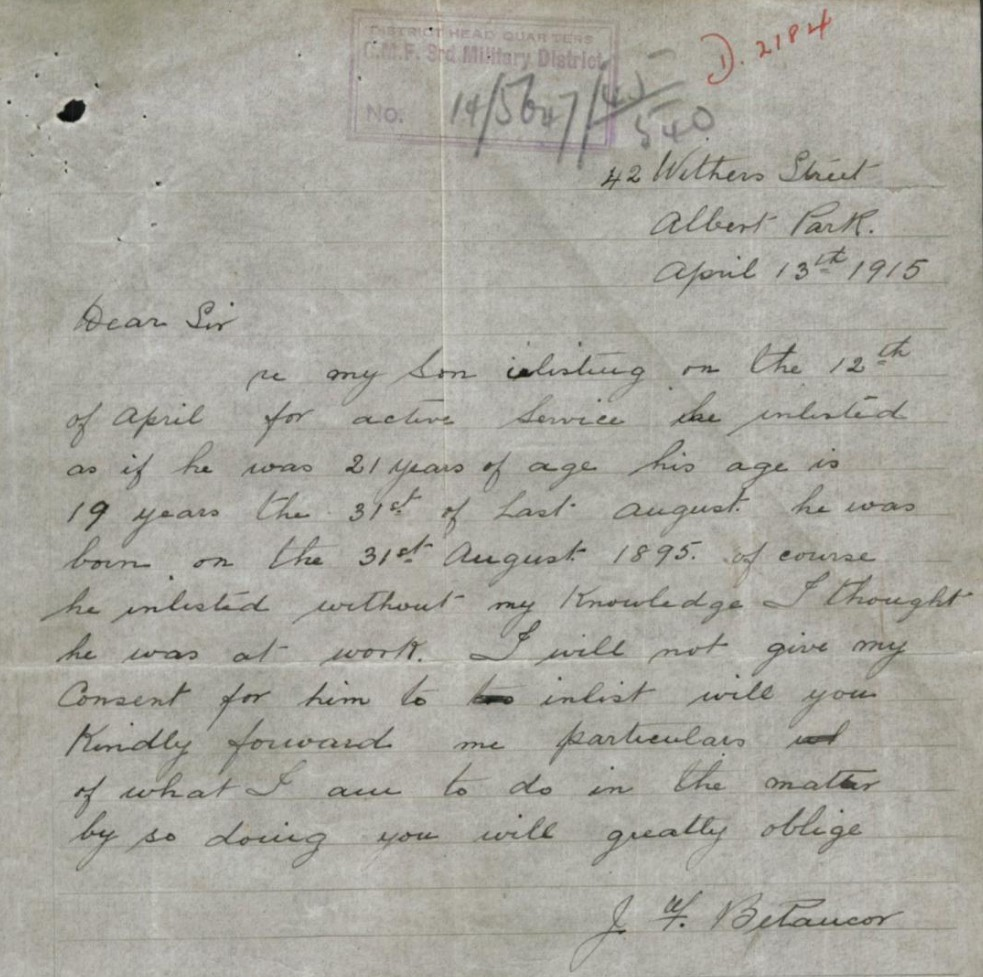 Eventually securing his parents’ consent, he successfully enlisted on 2 August 1915 in Geelong, Victoria.