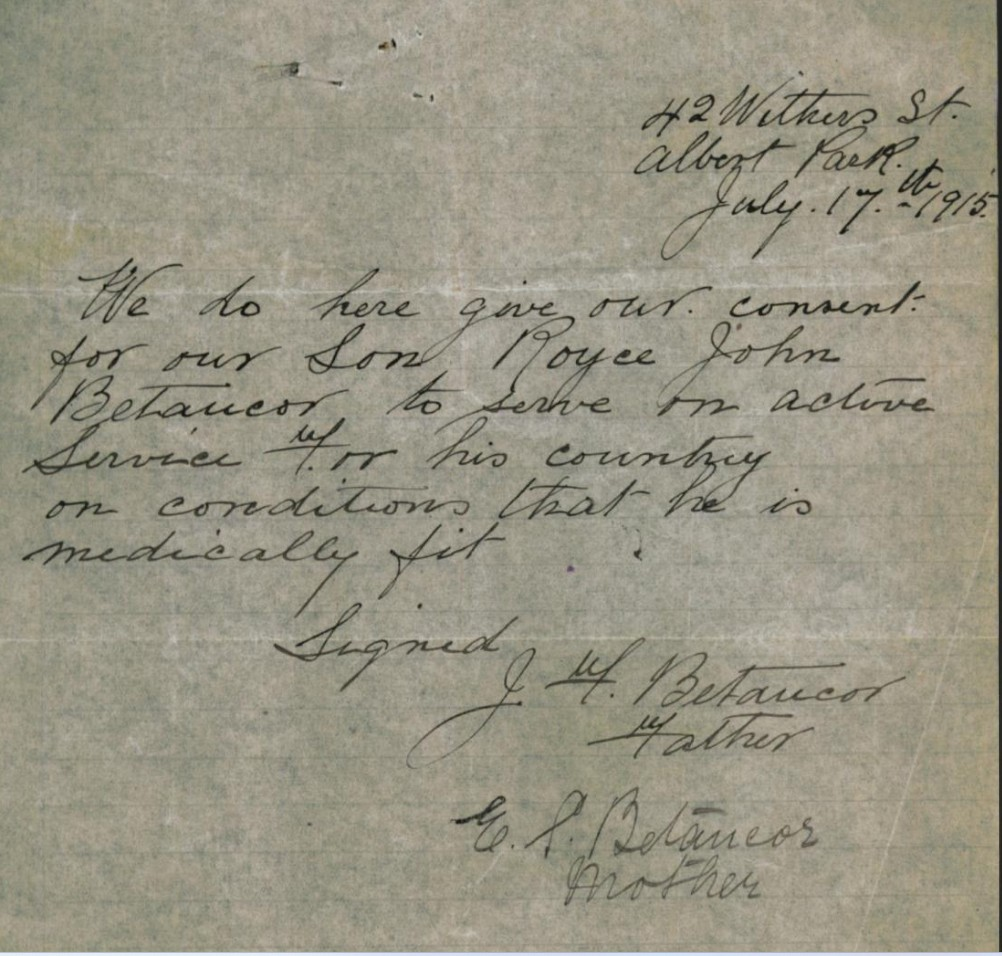 Royce John Betancor, who was known as Roy, was born in Melbourne on 31 August 1895, the middle child of John Francis Betancor and Ella Stewart Green of South Melbourne. He had two sisters, Ella, known as Weenie, and Viola: