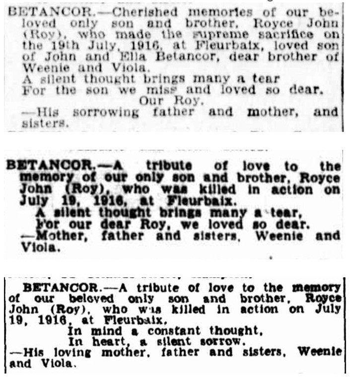 Roy was my paternal grandmother’s cousin. It is only in the last five years that I found any information about Royce Betancor while researching my family tree. In 2008 I was in France and went to Amiens, La Boiselle, Pozieres, Thiepval, Longueval and Villers Bretonneux as we joined a day tour of the battle grounds of the Somme and visited trenches, memorials and cemeteries.