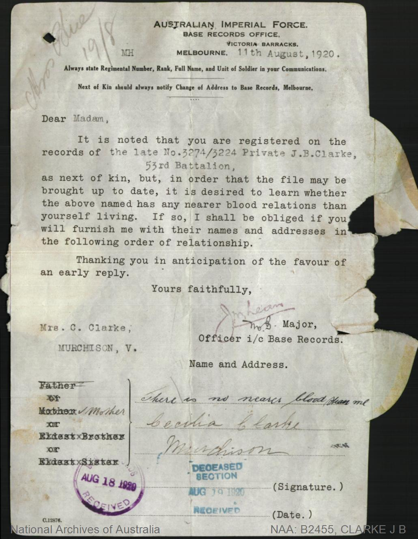 In the days and weeks after the Battle of Fromelles, Jack was first listed simply as “Missing.” His last letter home was sent on 14 July. Like hundreds of families across Australia, Celia Clarke waited for news that never seemed to come. Yet, without a body having been brought in, the Army could not confirm his death. More than a year passed while the Army and the Red Cross worked through their files, hospitals, witnesses and the information from the Germans before the inevitable truth was finally acknowledged.