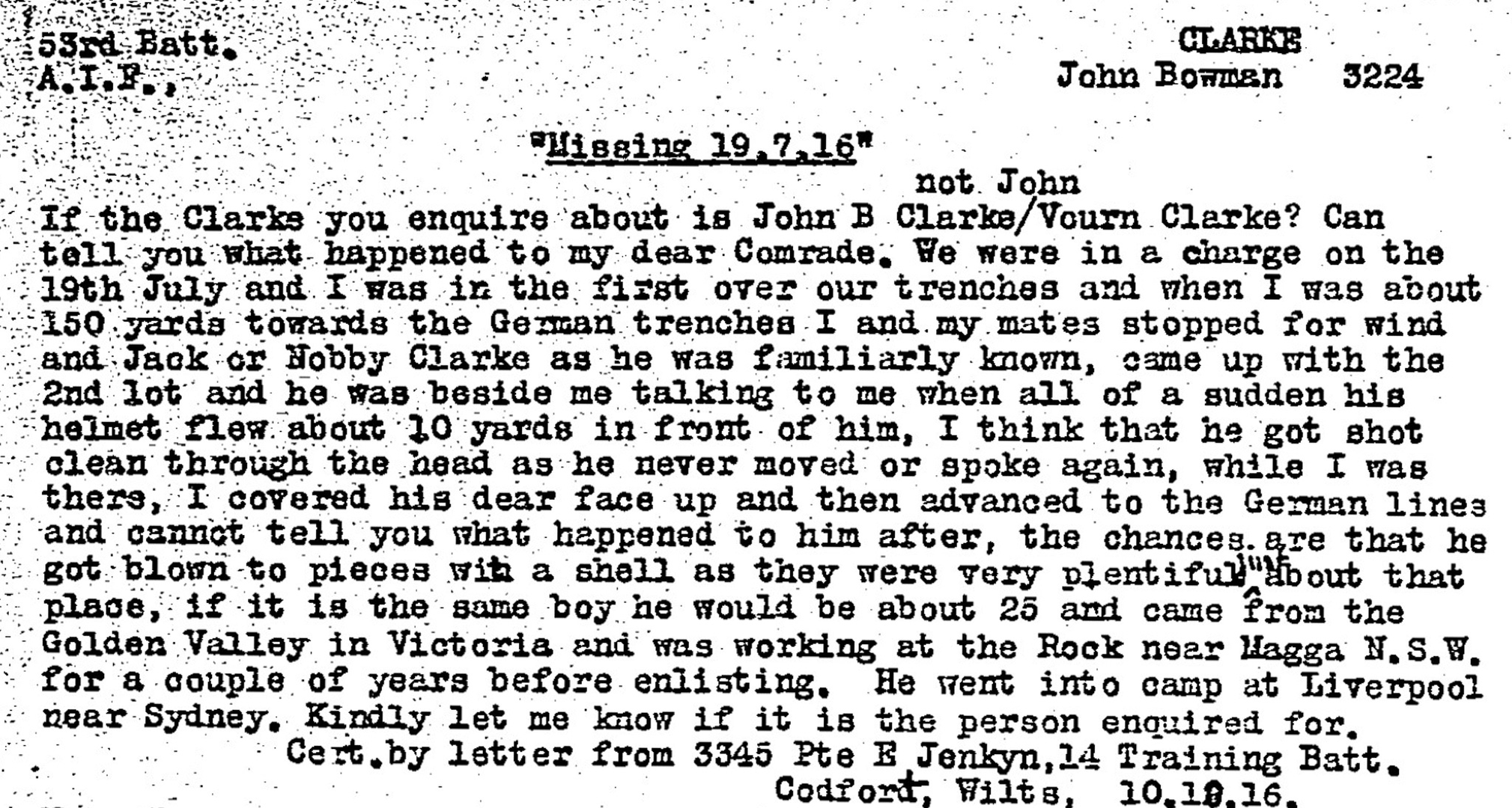 - John Bowman “Jack / Nobby” Clarke (1891–1916) – Reg. No. 3224, 53rd Battalion, Killed at Fromelles