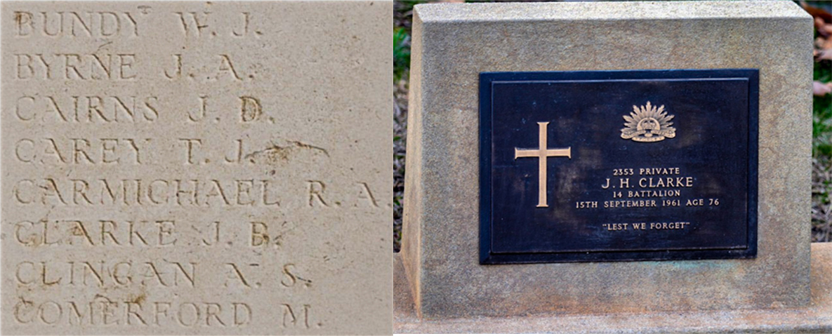 - James Henry Clarke (1884–1961) – Reg. No. 2353, 14th Battalion - Gallipoli, Egypt France. He was wounded