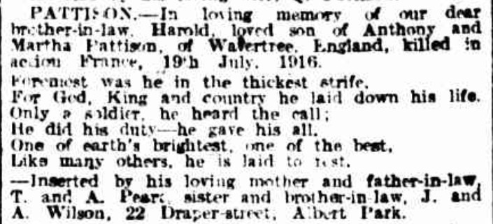 Killed in action, France, previously reported missing, 19th July, Harry, dearly loved husband of Lucy (Queenie) Pattison, 81 Stafford Street, Abbotsford.For King and country.