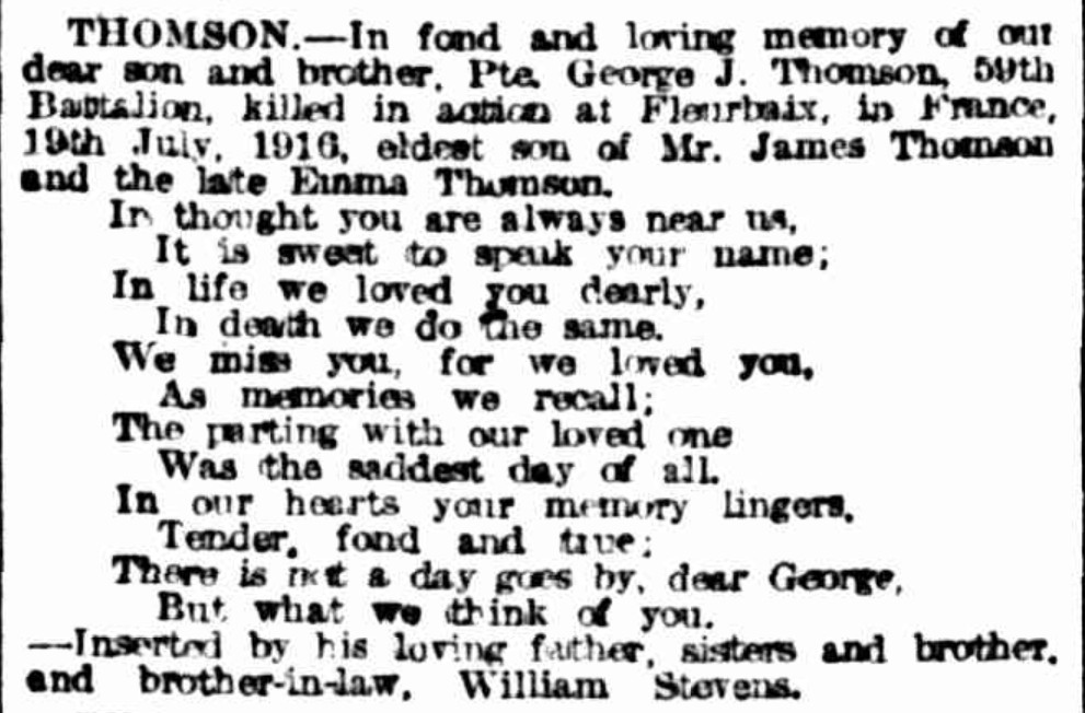 “Mr. J. Thomson, of Burt street, received news that his eldest son (George) has been missing since July 19.”