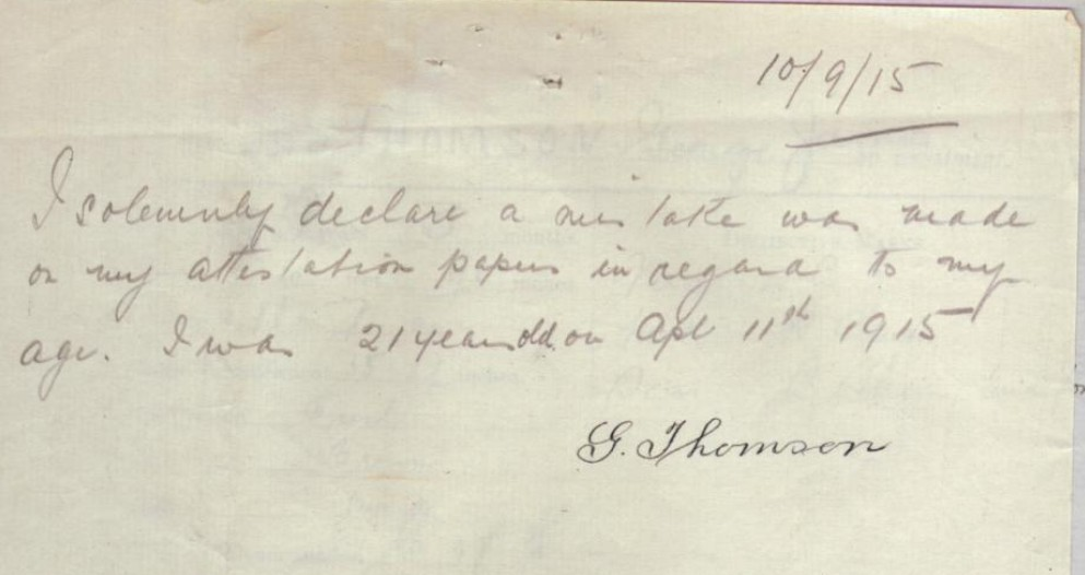 On 16 August 1915, the nineteen year old, six foot tall George Thomson left his home at 7 Burt Street, Northcote and volunteered for the AIF. On his papers he declared his age correctly as 19, but later supplied a statement that said he was 21 to avoid needing parental consent. Victorian birth records, however, show he was only 19 years old at the time. Adding years was a relatively common practice among enlistees keen to go to war. The Thomsons had earlier lost an infant son named George John Thomson in 1893.