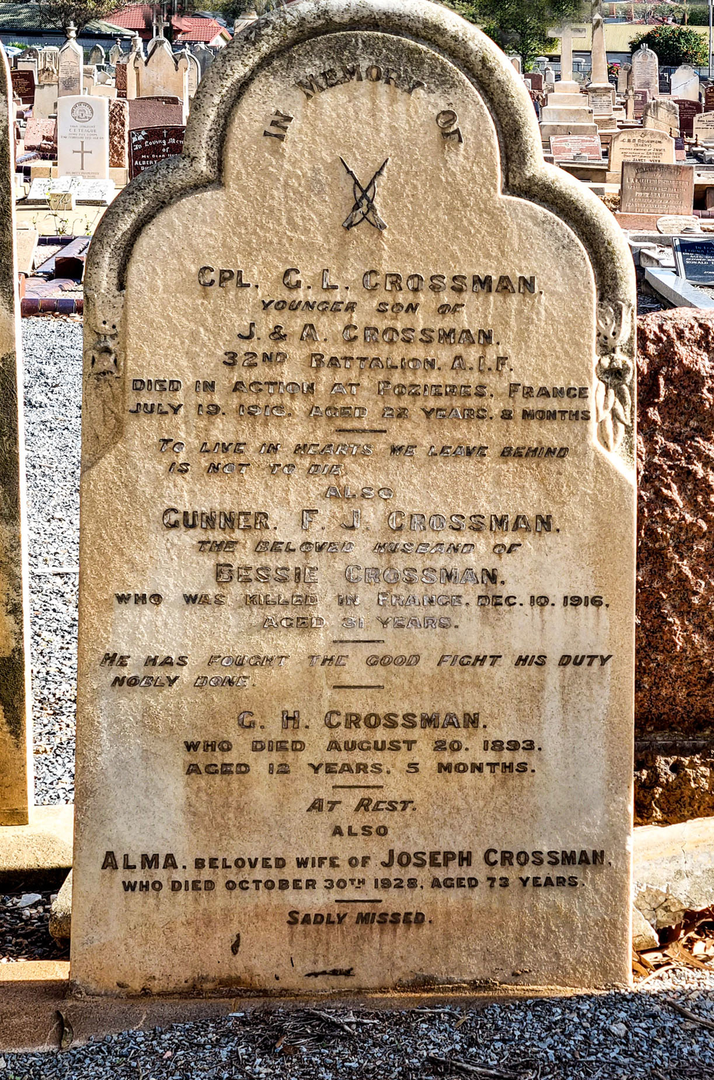 As the Crossman family was trying to come to terms with Gordon’s death, their grief was compounded on 10 December 1916, when their fourth son, Driver Fred Crossman, was killed in France. He was buried in Delville Wood cemetery. In the following years, family and friends remembered Gordon in “Heroes of the Great War” in memoriam notices. Included in these was one “In loving memory of my dear friend from ‘his friend, Dorothy Forster, Murray Bridge”. It is a reminder that the grief caused by a man’s death in the war was wider than the man’s immediate family, as young women mourned lost friends.