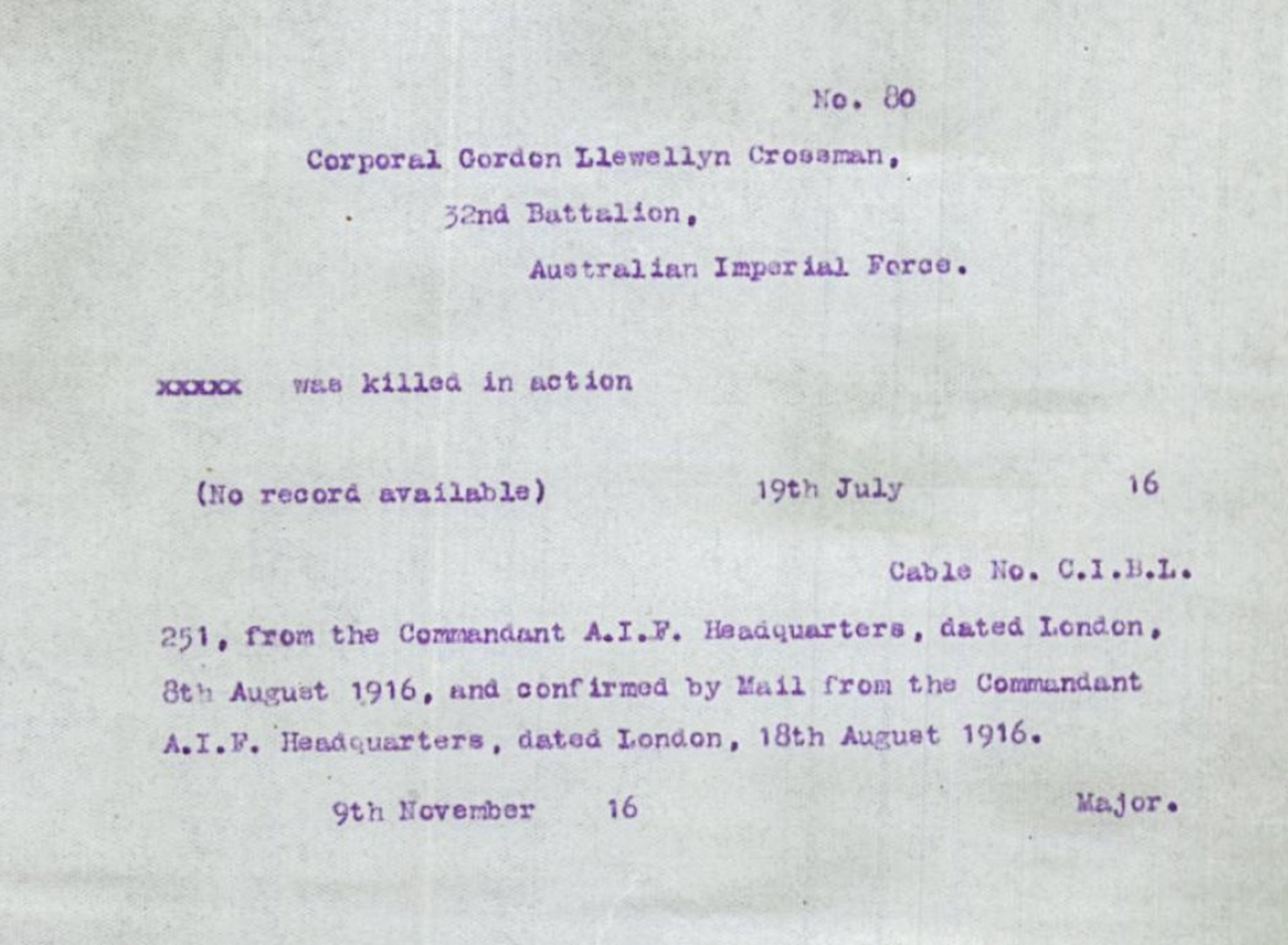 It was not unusual, and understandable given the lack of information from the military about the events at Fromelles, for the family of a man lost at Fromelles, like the Crossmans, to assume that he must have been killed at Pozières.