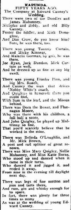 The Irish community in Kapunda into which Sam was born was large and inter-related. Judging by the poem written after the wedding in 1873 of his uncle Edward Canny (Bill and Bridget Canny’s second son), they knew how to enjoy themselves. The poem mentions Sam’s father, big James Mahenney (Mahoney), his grandfather, Billy Canny, his uncles, Thomas and Nicholas Canny, and Sam Quigley, as well as ‘the Quigley’s in hundreds’. ‘Big Paddy Curtain’ (Curtin) who was to marry Bridget Mahoney was also there.