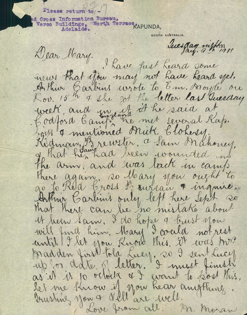Sam’s family and friends, perhaps fearing the worst, would have gone through a time of suspense and uncertainty as they waited for further news. Nothing more came from the military. However, in January 1917, Mary O’Neil received a letter from a friend in Kapunda which would have raised her hopes that Sam might be alive. A letter had been received from England, written by a Kapunda man who said that he had met several Kapunda boys at Codford Camp in England. These included Sam Mahoney, who had been wounded in the arm, but was back in camp again.