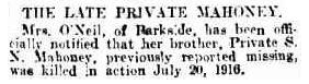 Sam Mahoney was killed during the battle. No record or eye-witness accounts exist to give any indication about what might have happened to him during the battle. However, his body was not recovered, and the military did not have sufficient evidence to officially declare him killed in action immediately after the battle. leaving open the possibility that he may have been wounded, captured, or in hospital. Late in August, Mary O’Neil was informed that he was missing. She passed on the information with a notice in newspapers on 1 September.
