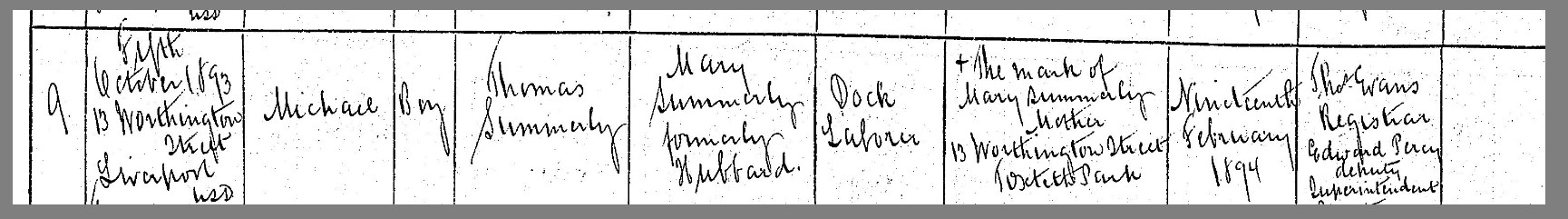 Michael Summerly was born on 5 October 1893 at 13 Worthington street, Liverpool, Lancashire, England, the youngest known son of dock worker Thomas Summerly and Mary Corbet. Thomas and Mary married in Ireland in December 1874 before moving to England, settling in the busy Merseyside district of Toxteth Park, Liverpool. Thomas and Mary Summerly had five children:
