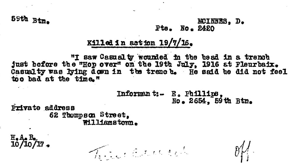 For the McInnes family of Williamstown, Fromelles became a permanent scar - three sons went forward together, only two came back. Donald was last seen in the trench as they were about to “Hop over”, based on a witness statement by platoon mate Private Edgar Phillips (2654) from Williamstown.