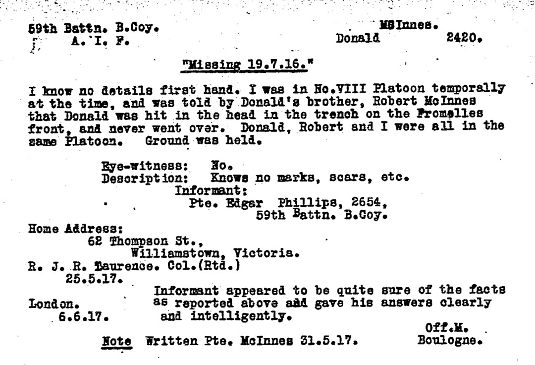 Donald’s wife Minnie was advised on 2 September that Donald was missing, but she had received no other information and was clearly anxious for more when she wrote the Army again on 12 December, now hoping he might have been taken prisoner. There was no information that the Army could provide her for either request. Nothing more followed until Donald was formally declared as killed in action on 19 July 1916 in an Enquiry in the Field which was held on 29 August 1917. The Battle of Fromelles left the McInnes family forever changed.