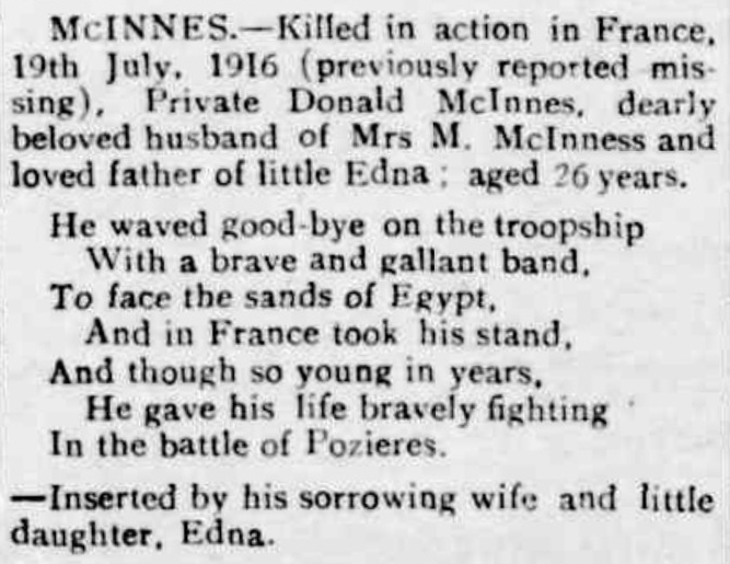 “PRIVATE DONALD MCINNESAnother local victim of the … Pozieres on Jul[y] 3" 1916 … Private Donald McInnes, 25 years of age and a native of Dover-road … His father and mother, Mr and Mrs Angus Bruce McInnes, whose home is now in John-street North Williamstown, are very old residents. The home of the deceased soldier however, in Cecil-street, where his wife and child reside. He attended the Central State school … He has three brothers on active service — Privates Norman John, Alexander and Robert McInnes.”