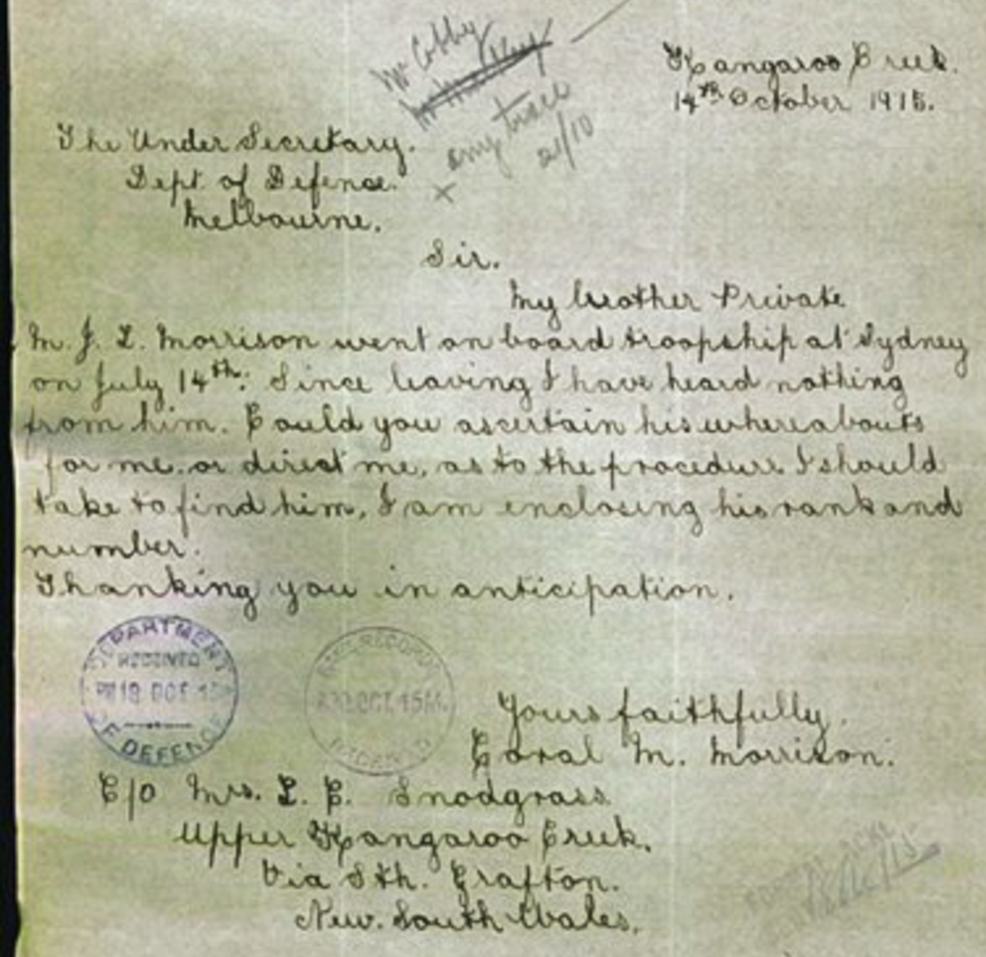 - July 1917: Coralie herself wrote from Hernani, near Armidale - “On the 19th July 1916, No. 2451 Pte. M. J. L. Morrison … was reported missing. Since then I have heard nothing … hoping you can tell me something.”