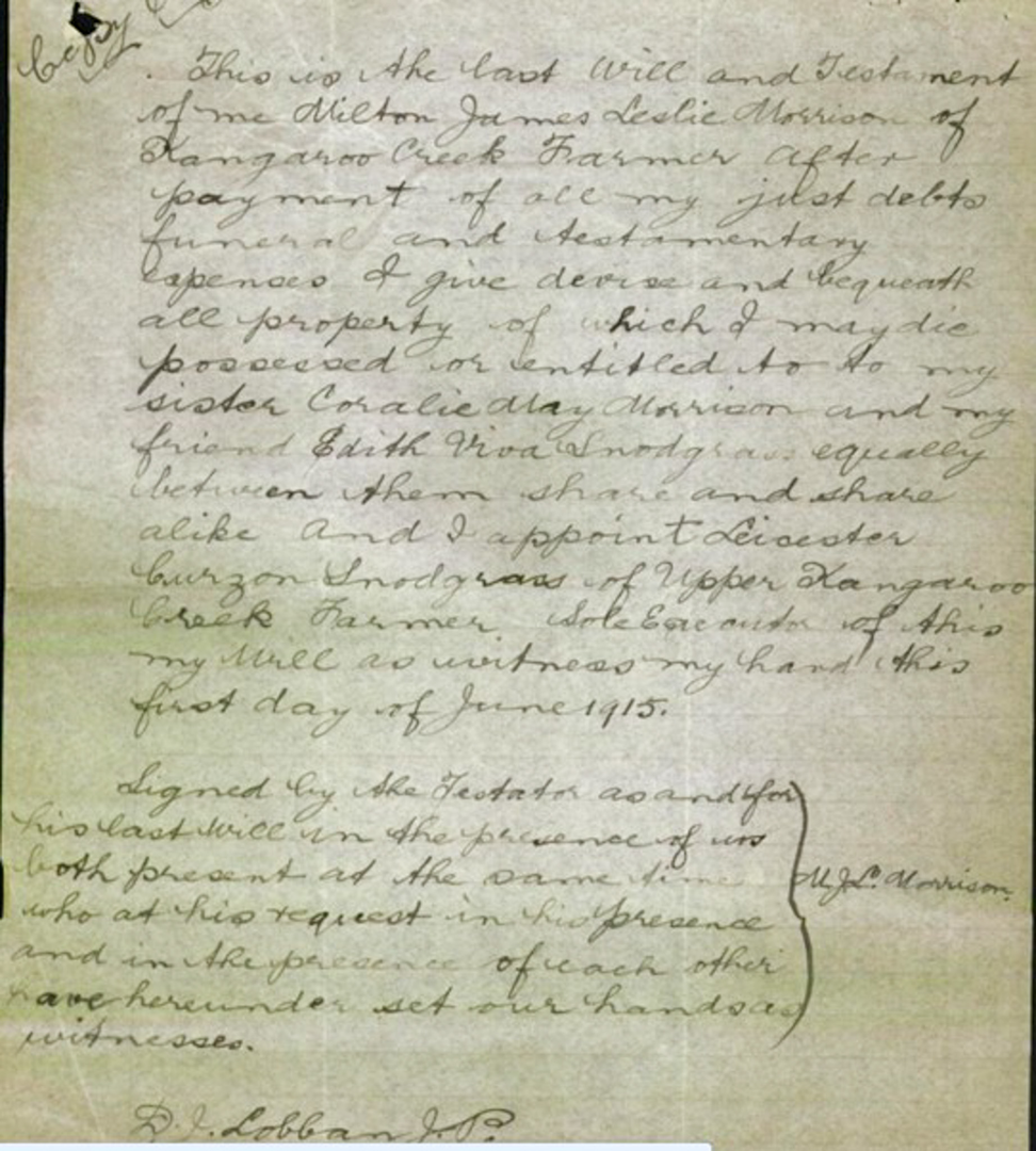 While Milton had stated his father as next of kin, it appears that he may have anticipated issues and on 1 June 1915, just before embarking, he had drawn up a will at Kangaroo Creek leaving his estate equally to his sister Coralie May Morrison and his friend Edith McLachlan, appointing local schoolteacher Leicester Curzon Snodgrass as executor.