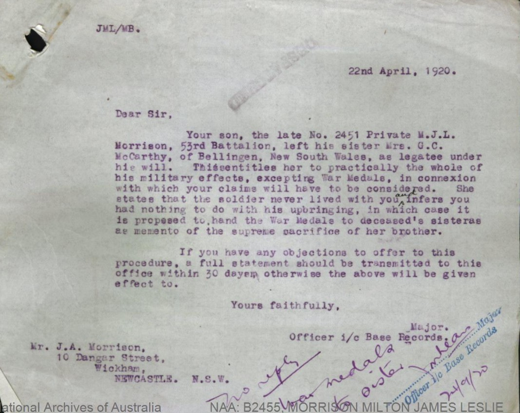 “I am his only sister and was left next-of-kin, also his will. Pte. Morrison has never lived with his father since a small child, and his father knows nothing at all concerning him.”