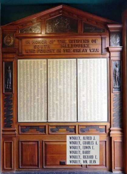 - South Melbourne Roll of Honour – listed together with his cousins Charles, William, Richard, and Ernest Windley.