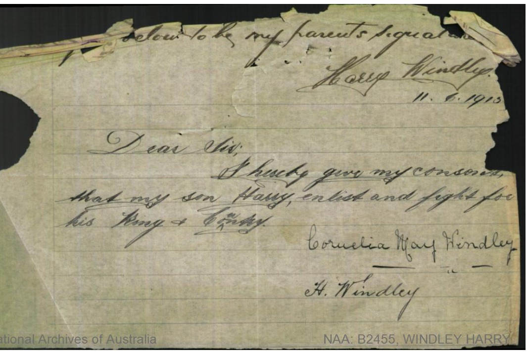 By mid-1915, Harry was eager to enlist, despite being only just 18 years old. His youngest sibling then only two. Like many underage volunteers, he required the written consent of his parents. On 11 June 1915, his mother Cornelia Mary Windley signed a note granting permission:
