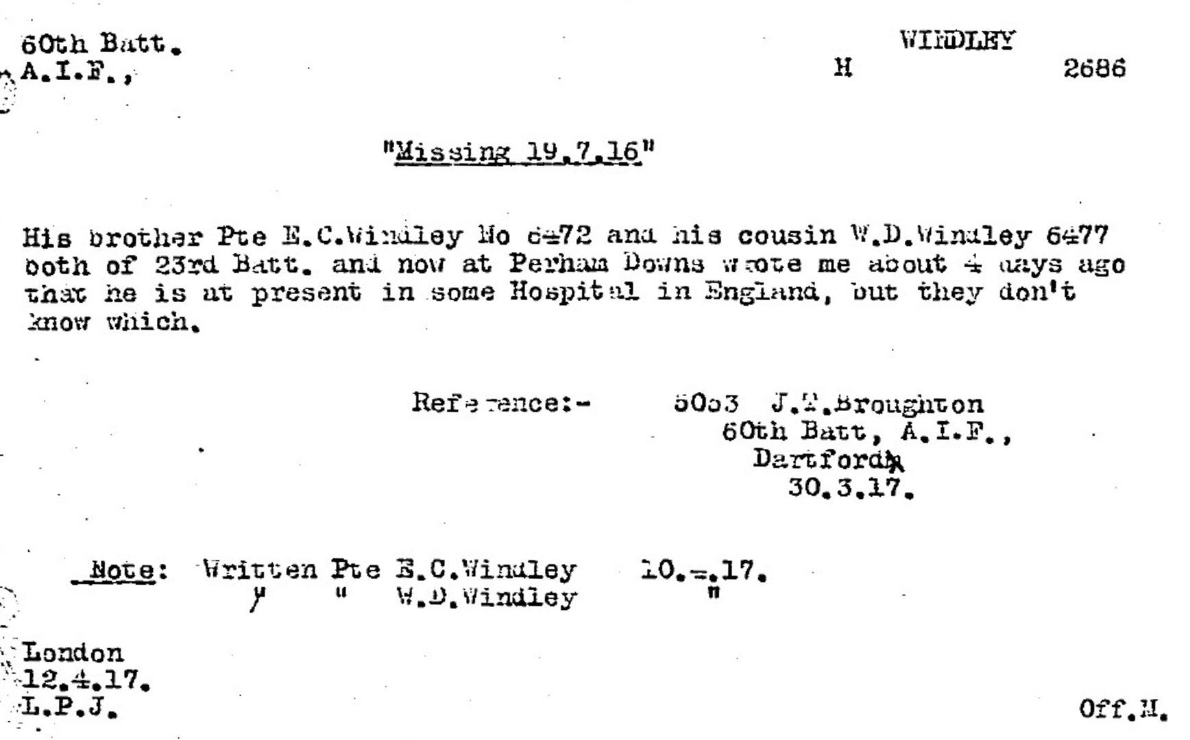 In March 1917, Private J.T. Broughton (5053) from South Melbourne reported a ‘good’ outcome - “His brother Pte Ernest E. Windley and his cousin William.D. Windley … wrote me about 4 days ago that he is at present in some hospital in England, but they don’t know which.” (note – Harry’s cousins Ernest and William were brothers).