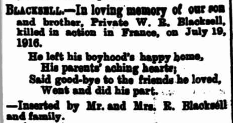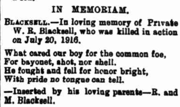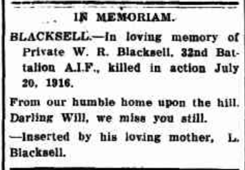 “The friends of Mr and Mrs R. Blacksell, of Naracoorte, will learn with deep regret of the death of their son, Private William Blacksell, who has been killed in action in France… He was only 23 years of age, and was well known and respected throughout the district.”