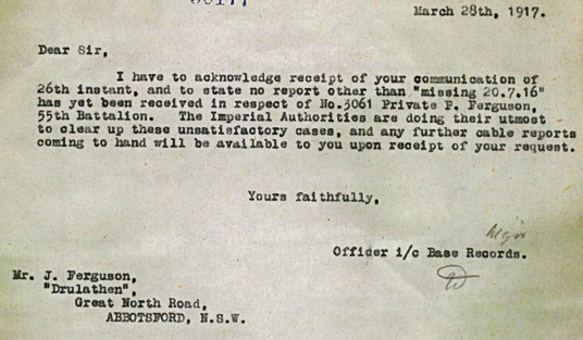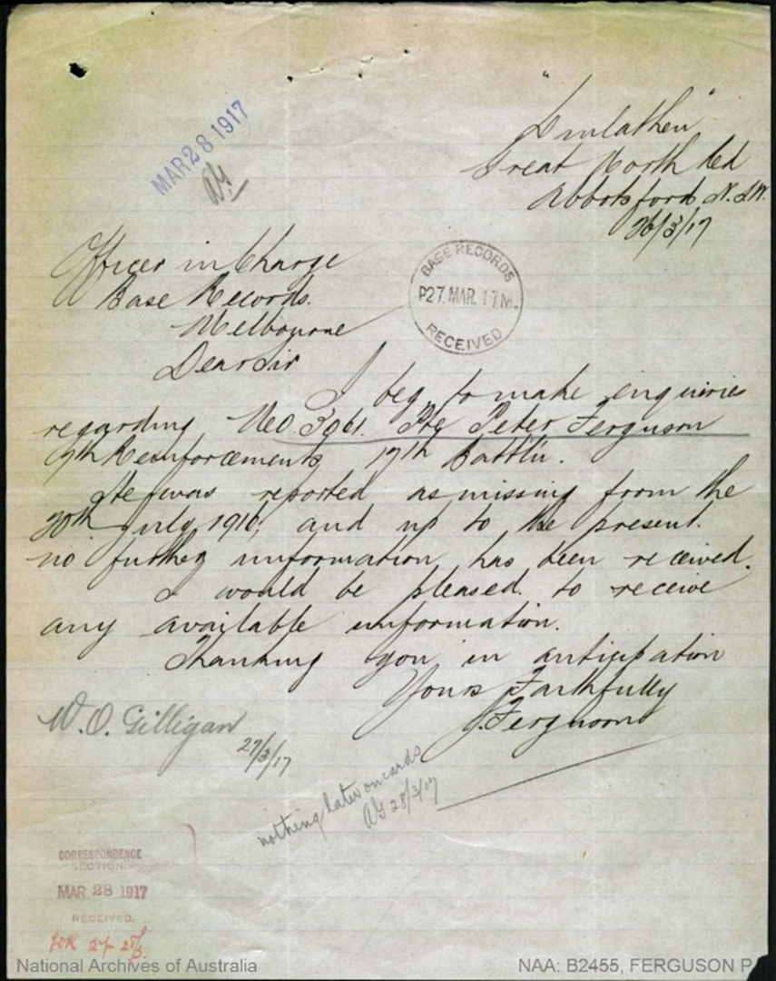 Following the battle, Peter was listed as missing in action. His name appeared on early casualty lists sent to London and to his mother in Glasgow. Back in Sydney, John Ferguson and wife Jessie become involved in the search for information for what happened to Peter.