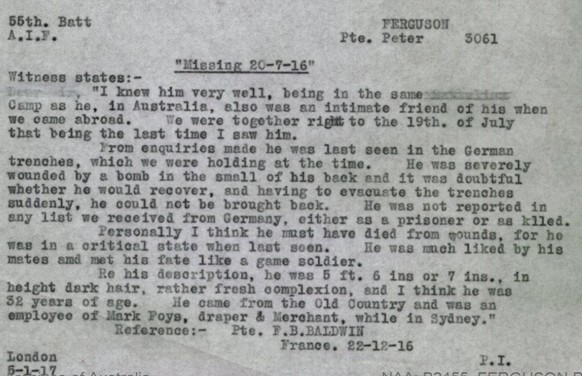 “On the 20th July at Fromelles, he was in a bombing party during an attack. I was also in the party. It was just daylight. We got to the German lines and a bomb dropped behind Ferguson who was very badly wounded. We took him along the trench to try and find stretcher bearers. We were ordered to leave him and to carry on. Later on we evacuated that part of the line and so far as I know Ferguson was not heard of again.”