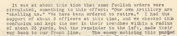 A bayonet charge was made by about 50 men and they were able to advance about 60 yards. By 1.00 AM things had quietened down, but only for a short time. About 3.00 AM some ‘foolish orders’ were circulated that they were being bombed by their own side and were supposed to retreat. These were believed to be incorrect and they fought on.