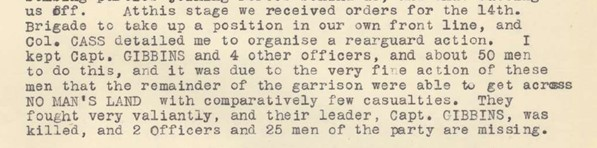 “It was due to the very fine actions of these men that the garrison was able to get across No Man’s Land with comparatively few casualties.”