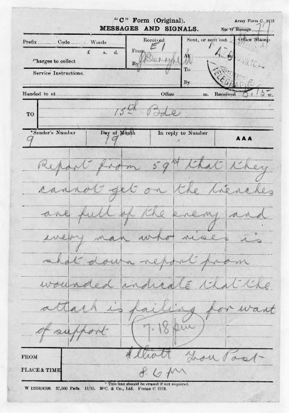 Their attack on the German lines began at 5.45 PM on the 19th. The 59th went over their parapet in four waves at 5 minute intervals, but then laid down to wait for the support bombardment to end at 6.00 PM. A & B Companies were in the first two waves, C & D in the next two. There was immediate and intense fire from rifles and the Sugar Loaf machine guns. As documented in the messages sent back to HQ just after the attacks began: