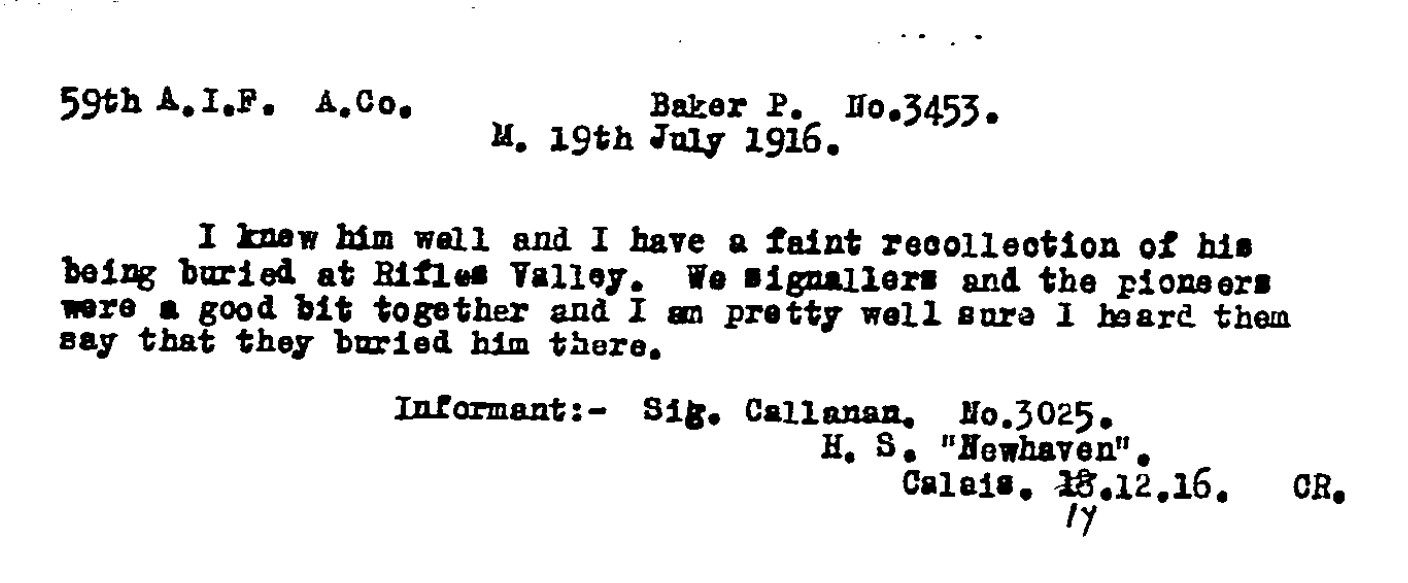 However, Signaller Callanan (3025), recalled in December 1916 that he had a faint recollection of Baker being buried at the Rifle Valley aid station, noting that the signallers and pioneers had been working together and that he was fairly sure he had heard they buried him there.