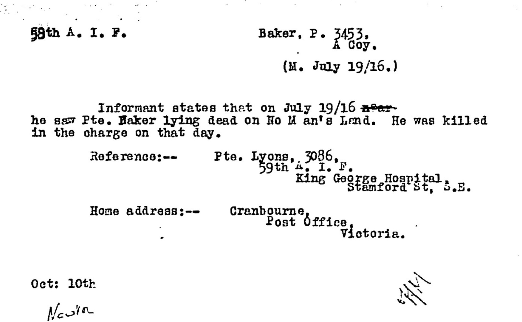 Percy and Charlie were not among those at their unit’s roll calls, but at least Hughie was. Percy was listed as missing in action and for months his family could learn nothing else of his fate. Percy’s stepmother, Ann Baker, wrote to Base Records desperate for news. On 9 October 1916 she wrote:
