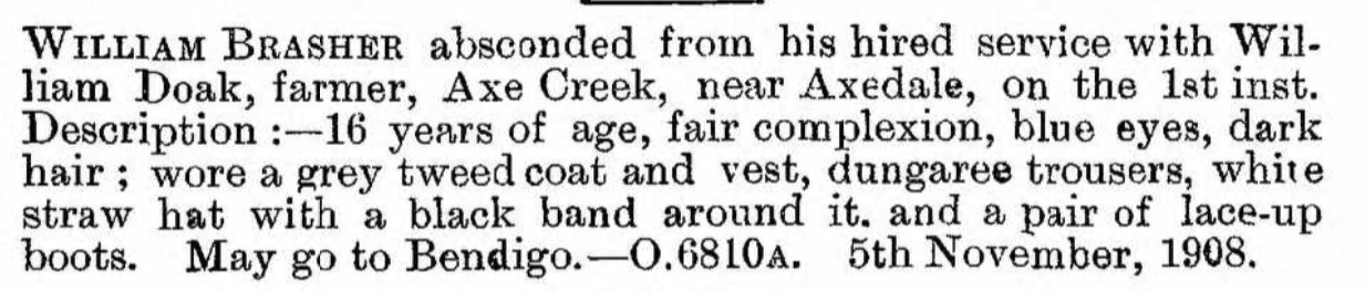At 16, he absconded from a farm placement at Axe Creek, a detail later noted in the Victorian Police Gazette.