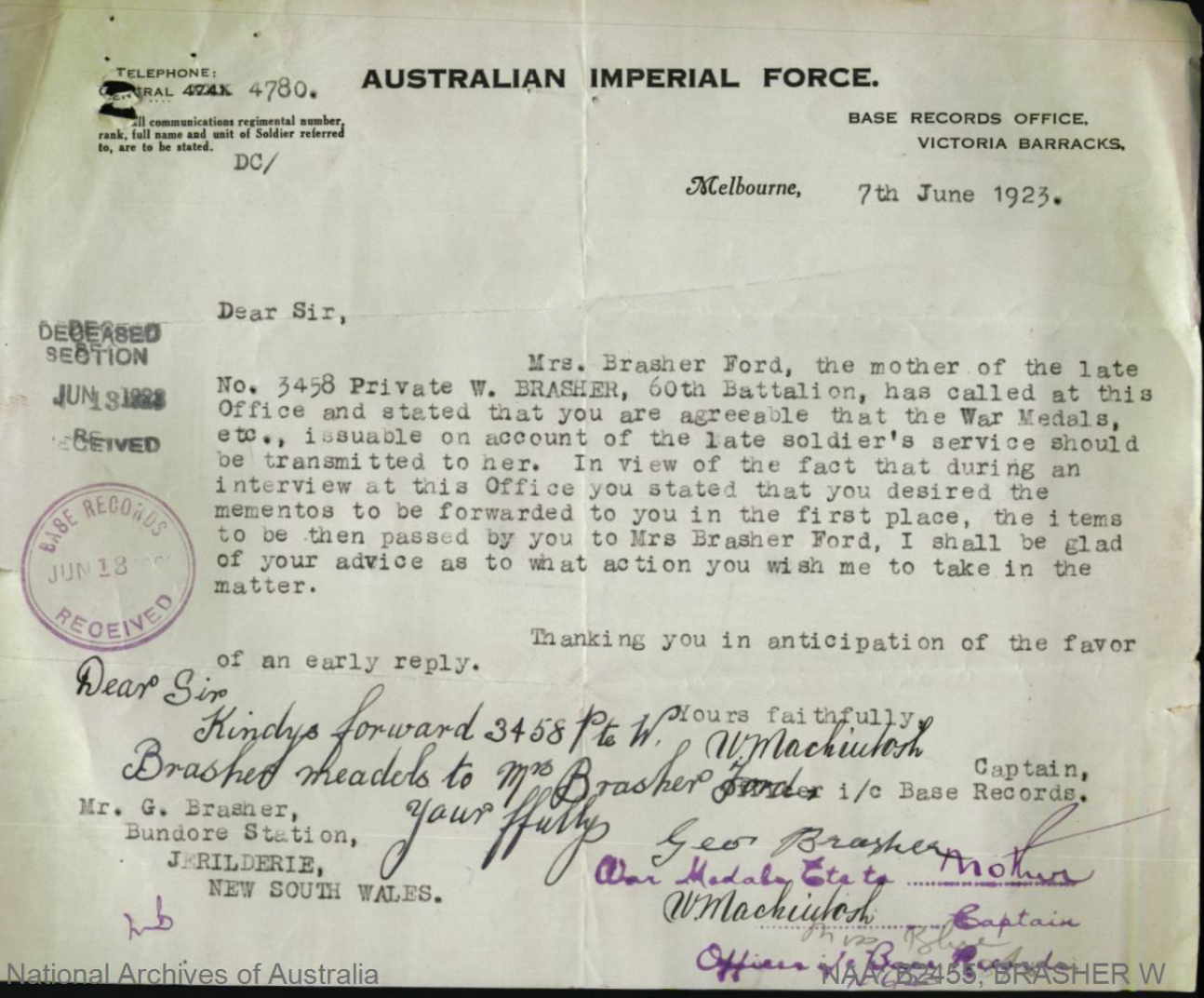 William Brasher’s body was never found after the Battle of Fromelles and there are no records of his burial.