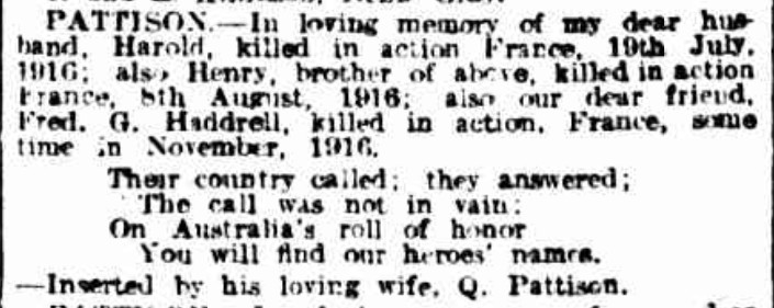 Killed in action, France, previously reported missing, 19th July, Harry, dearly loved husband of Lucy (Queenie) Pattison, 81 Stafford Street, Abbotsford.For King and country.