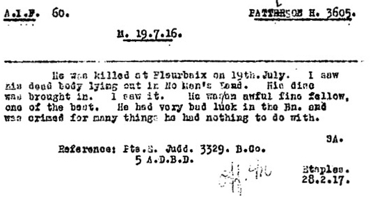 Despite her request, Base Records Office’s form letter advised Queenie - “After full investigation, this office regrets to advise that no information has been obtained regarding the burial of your husband, the late No. 3605 Private H. Pattison, 60th Battalion. It is therefore concluded that he has no known grave.” Source - NAA B2455, PATTISON Henry – First AIF Personnel Dossiers 1914–1920, p. 16