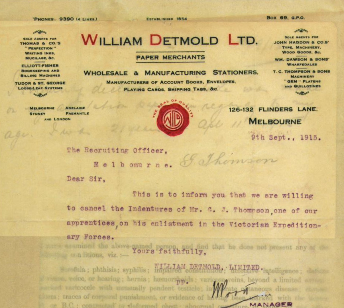 The children were then raised by their father, James - with eldest daughters Gladys at 18 and Emma 16, plus Emma’s maiden Aunt Emma and other relatives assisting. The White family were in surrounding suburbs. After his schooling, George began an apprenticeship with William Detmold Ltd., a major Melbourne printing and stationery manufacturer. When he enlisted in 1915, the company formally released him from his indentures.