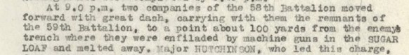 Their attack on the German lines began at 5.45 PM on the 19th. The 59th went over their parapet in four waves at 5 minute intervals, but then laid down to wait for the support bombardment to end at 6.00 PM. A & B Companies were in the first two waves, C & D in the next two. There was immediate and intense fire from rifles and the Sugar Loaf machine guns. As documented in the messages sent back to HQ just after the attacks began: