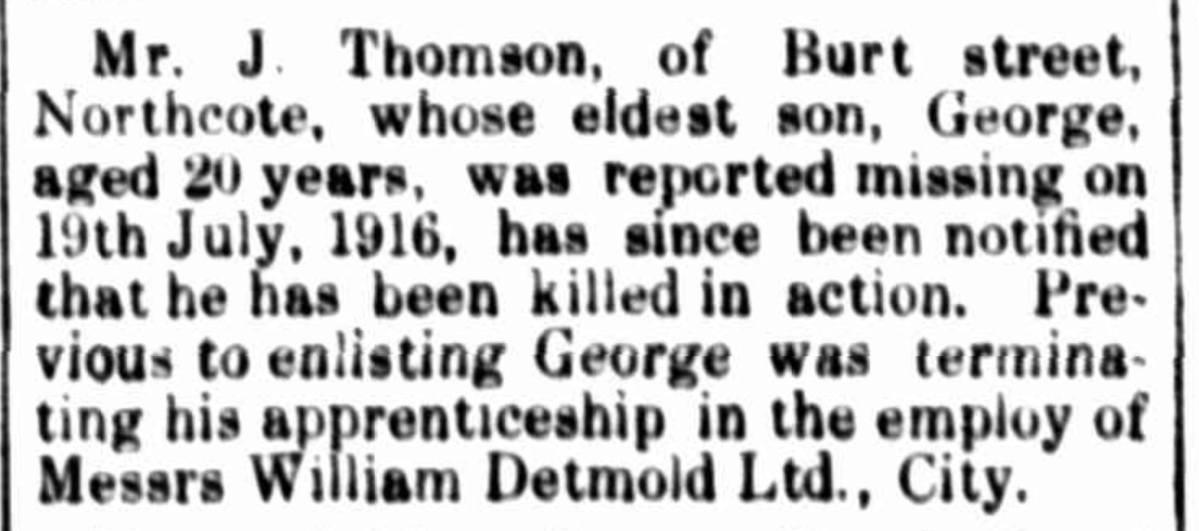 “Mr. J. Thomson, of Burt street, received news that his eldest son (George) has been missing since July 19.”