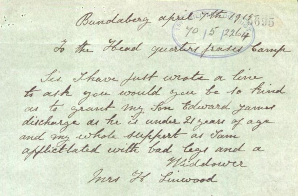 “Sir, I have just wrote a line to ask you would you be so kind as to grant my son Edward James discharge as he is under 21 years of age and my whole support, as I am afflicted with bad legs and a widower.” — Mrs H. Linwood, Bundaberg, 9 April 1915