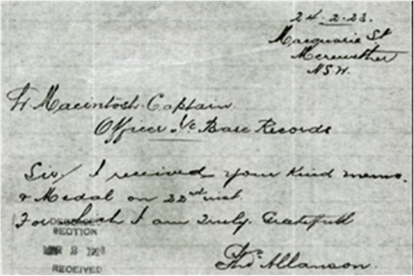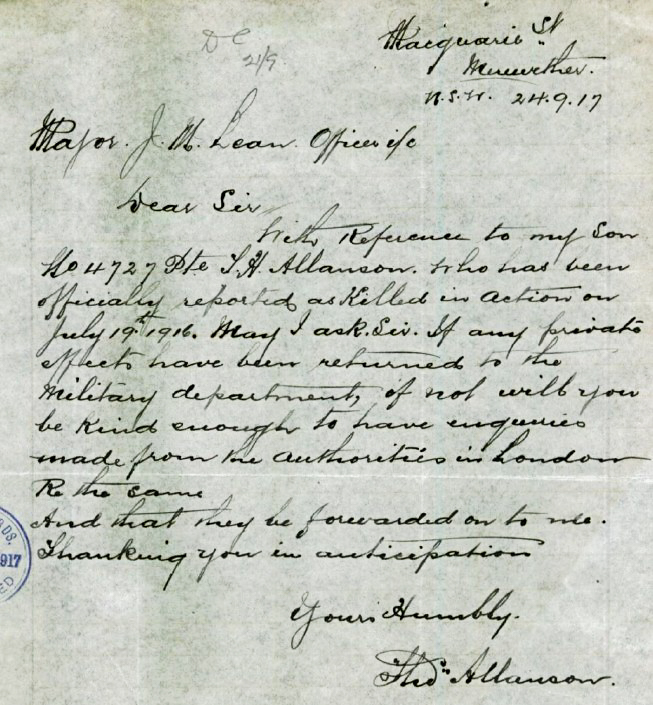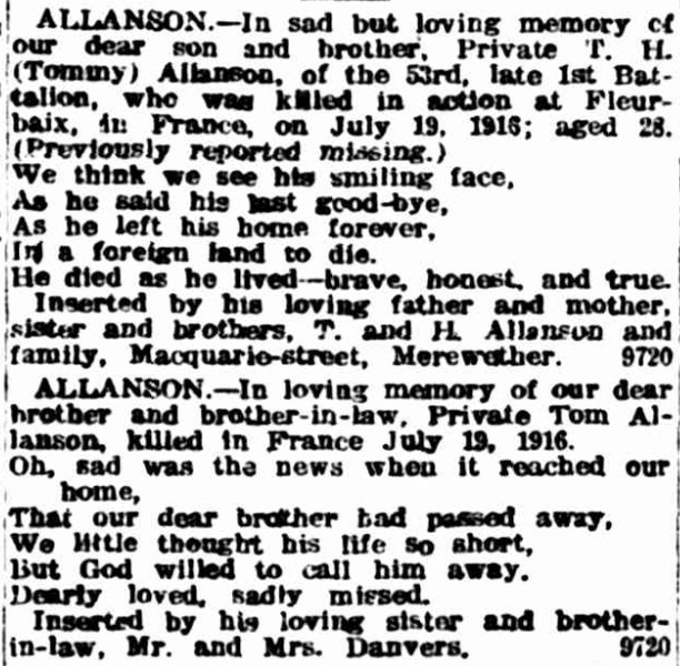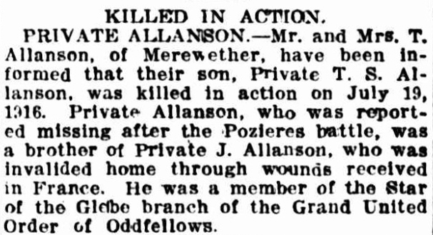 Source - AWM Roll of Honour Circular – Thomas Henry Allanson, completed by T. and H. Allanson, Merewether, NSW