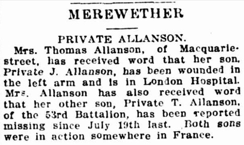 The war touched every branch of the Allanson family in Merewether. Parents Thomas and Hannah Allanson (née Smith) raised a close Methodist household, active in the Glebe Church and Merewether Public School community. Tommys brother Private James “Jack” Allanson (2333, 19th Battalion) – wounded in France was invalided home to Australia on 9 September 1916. Their cousin, Private Joseph Lewis Allanson (2028, 34th Battalion), also served. A tailor by trade, he enlisted in March 1916, sailed with the 3rd Reinforcements, and returned home safely in October 1918 after service on the Western Front.